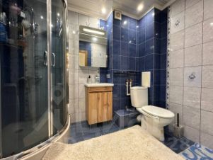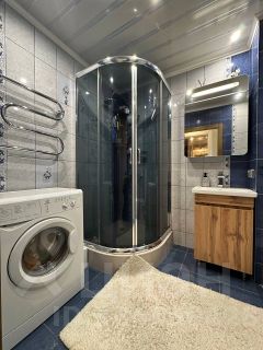 • Совмещенный санузел в кафеле, на полу керамогранит, душевая кабина, тропический душ.
