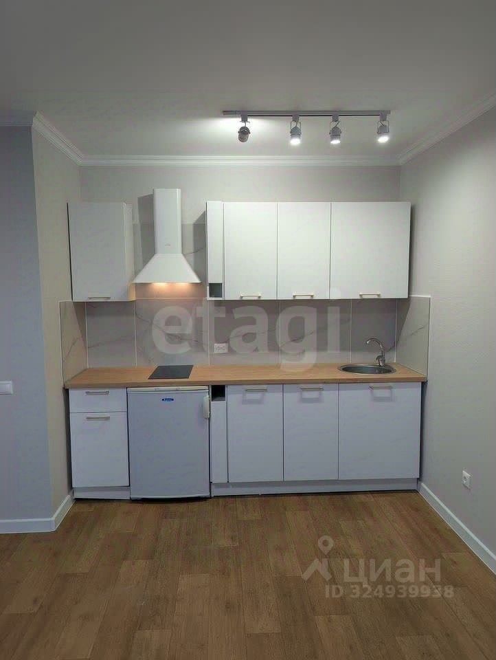 Установлен новый встроенный кухонный гарнитур, уже с варочной панелью и вытяжкой, холодильник.
