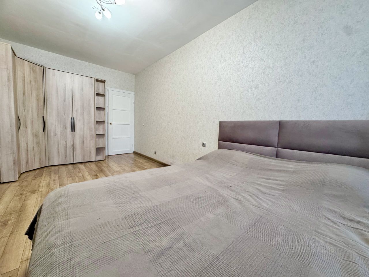 Стены выровнены и оклеены виниловыми обоями в светлых тонах