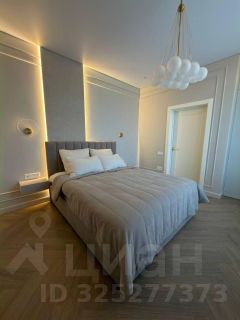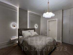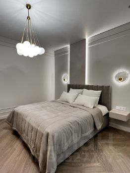 Изолированная спальня (разные световые решения, настенные бра, потолочная люстра, светодиодная подсветка, встроенный шкаф).