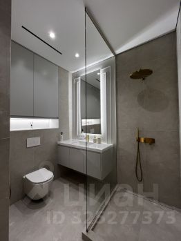 Сан.узел совместный. Душевая зона (Walk-in) со стеклянной перегородкой до потолка. Встроенная мебель, инсталляция, скрытая сантехника, раковина с тумбой и столешницей из искусственного камня.
