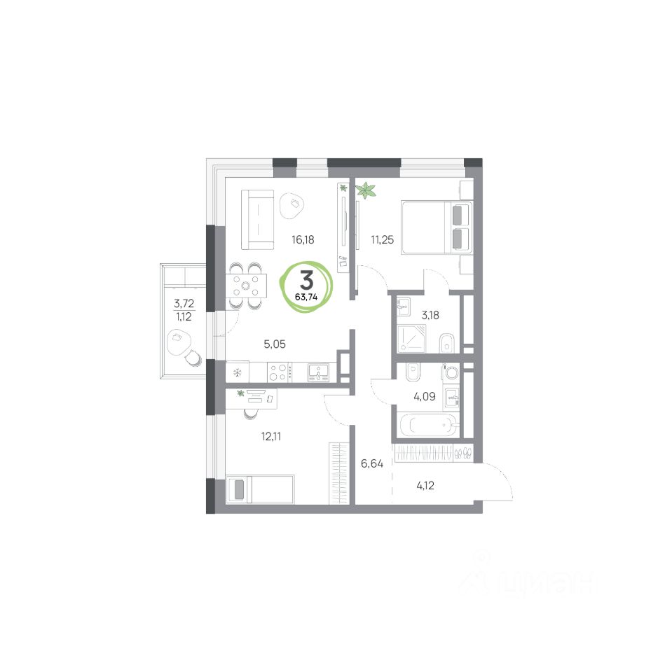 3-комн. квартира, 63,74 м²