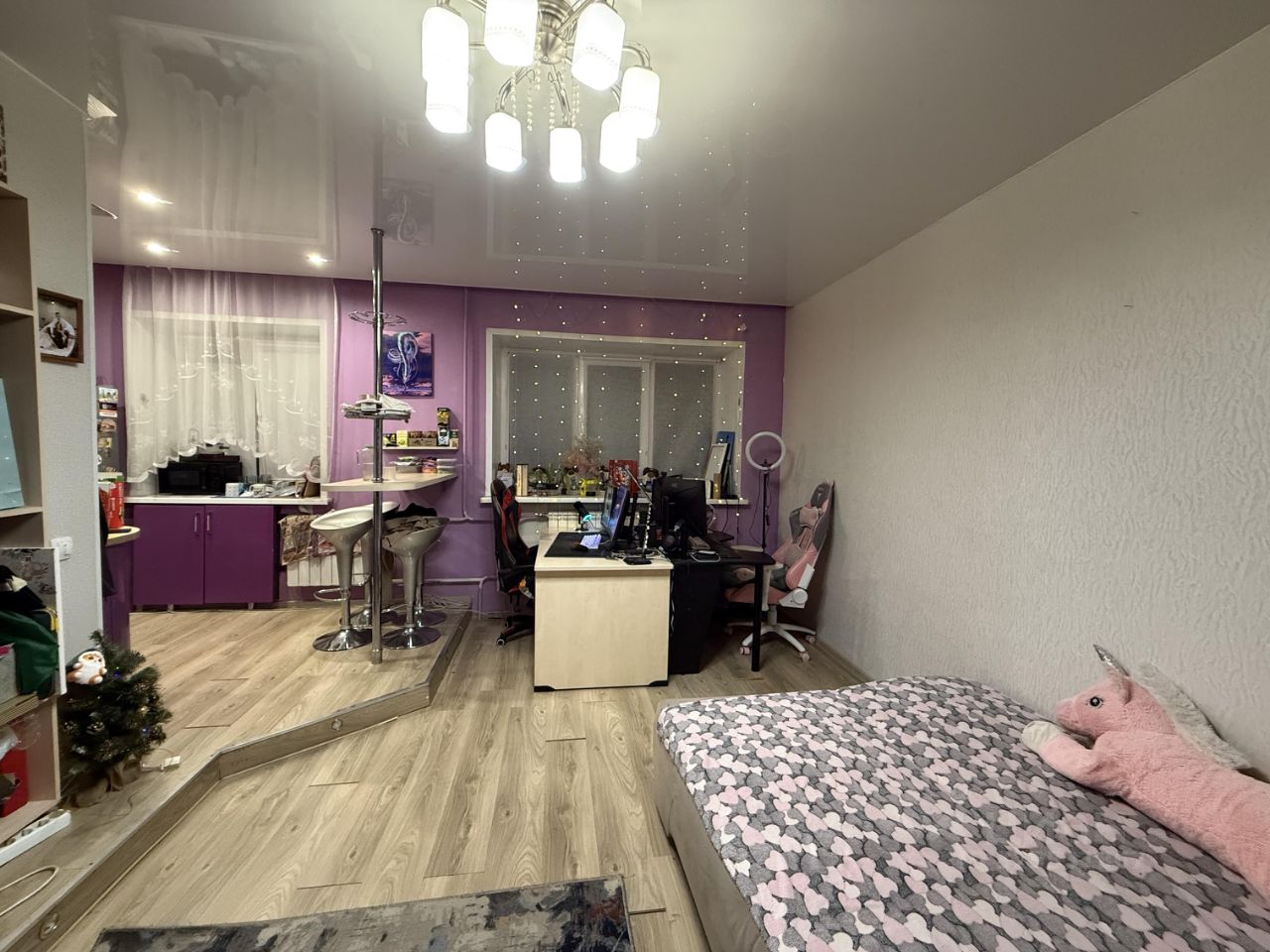 Оставим будущим жильцам: кухонный гарнитур, большой встроенный шкаф, барную стойку, встроенную индукционную плиту (полностью рабочая). Остальное - по договоренности.