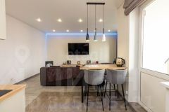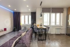 Стильный и практичный ремонт: натяжные потолки по всей квартире, полы — плитка и ламинат, в санузле — комфортные теплые полы.