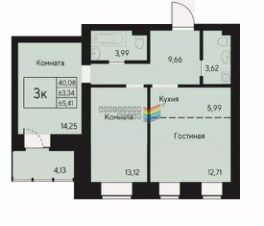 3х комнатная квартира с кухней-гостиной 18 м2, большим просторным коридором 9.66 м2, где есть место под гардеробную, и комнатами 13 м2 и 14.25 м2 с выходом на балкон с видом на природу.