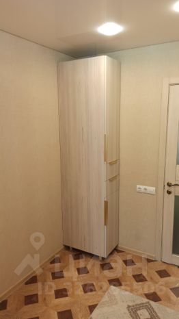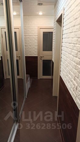 В коридоре большой встроенный шкаф-купе с зеркальными дверьми, пуфик.