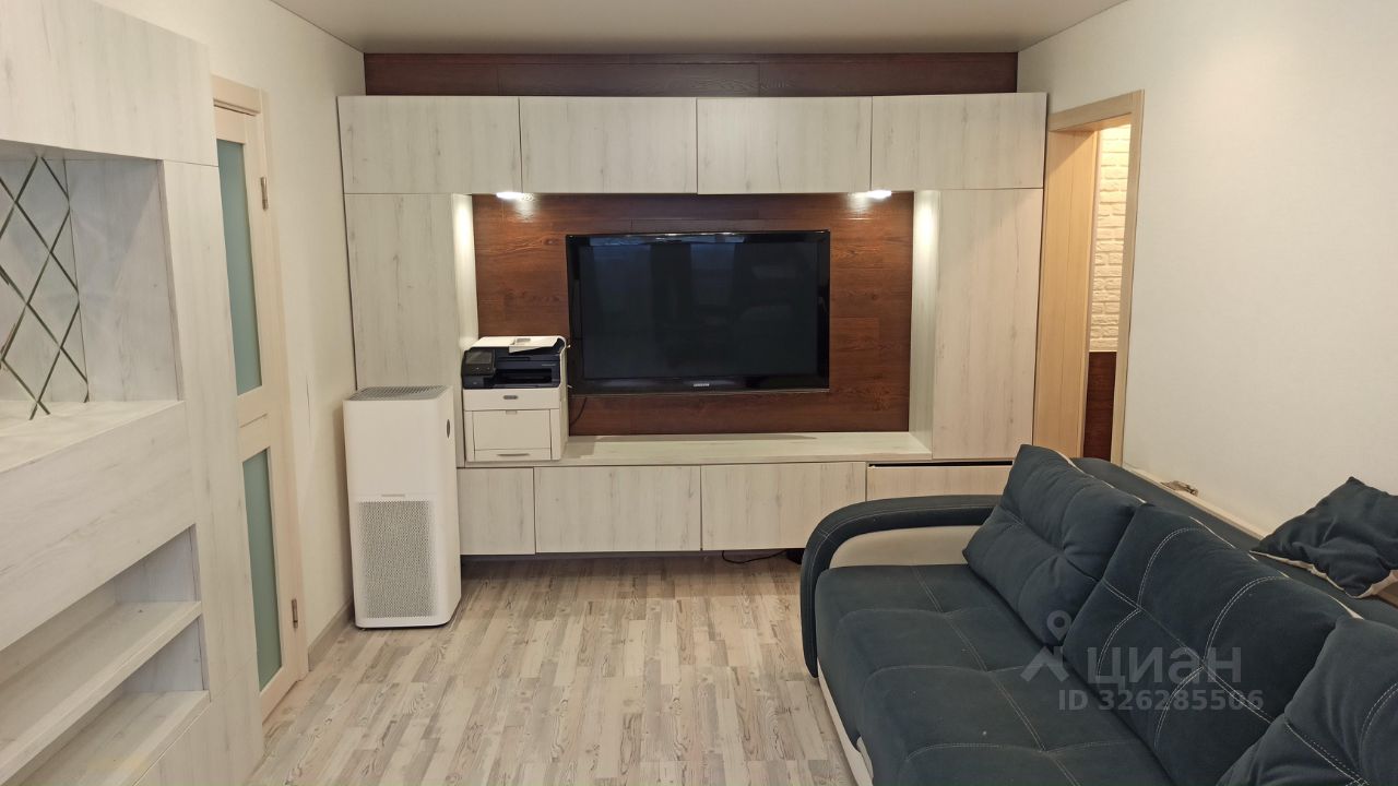 В гостиной большой диван, телевизор, много шкафов для хранения.