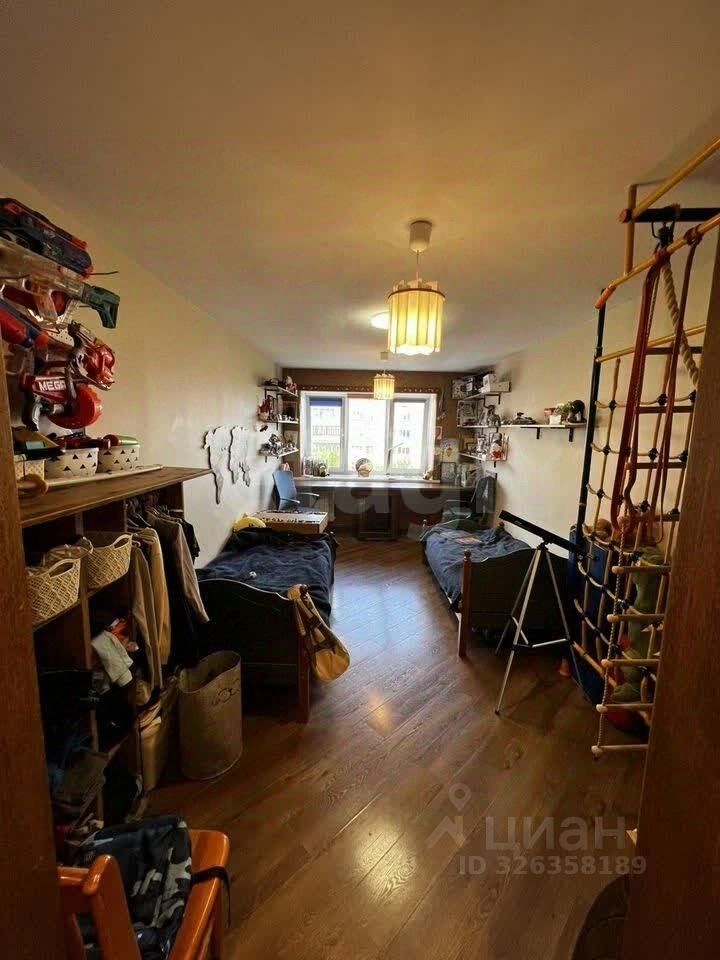 Детская 16м.кв. Оборудована спортивным тренажером: шведской стенкой - турник с канатом и кольцами, полностью меблирована кроватями, шкафами, системой хранения и полками. Вдоль широкого трехстверчатого окна на всю ширину комнаты сделана парта из массива для двоих детей.