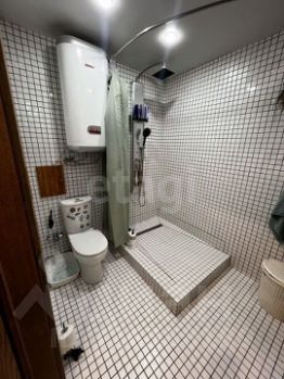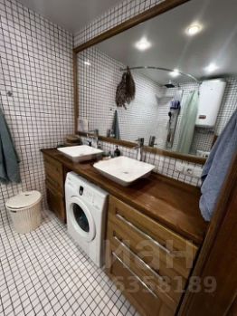Ванная с двумя раковинами и большим зеркалом, отделана мозаикой и массивом дуба, столешница - массив лиственницы. Стиральная машина и бойлер водонагреватель на 80л.