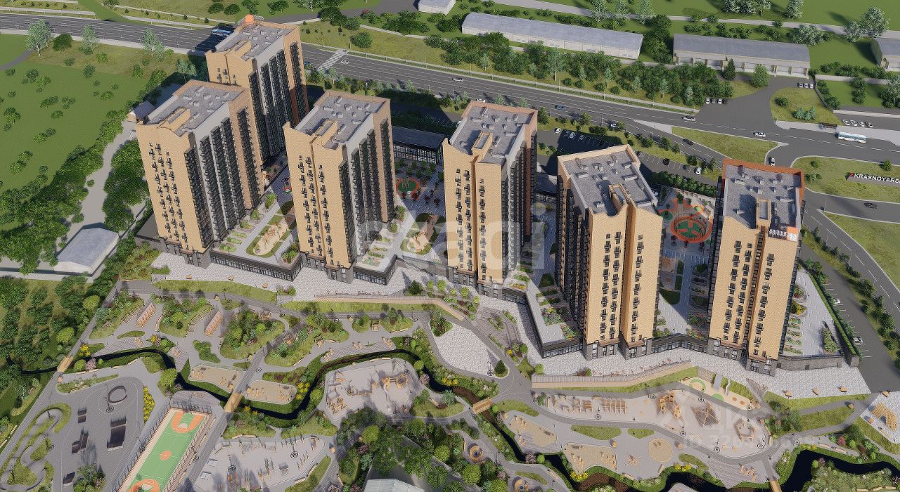В составе мини-района 5 жилых кирпичных корпусов по 17 этажей и один 16-этажный, они объединены общим стилобатом с подземным паркингом; два торговых павильона, отгораживающие приватный двор от оживленного транспортного потока по ул. Калинина, и общественное пространство зеленый Долина-парк в пойме р. Бугач.