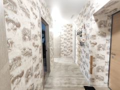 Кухня не маленькая, умещает давольно вместительный кухонный гарнитур. Санузел совмещенный. Изюминка данных планировок-это гардеробная, она достаточно вместительная, что можно разместиться так, что и вещи и бытовые принадлежности разместятся гармонично.