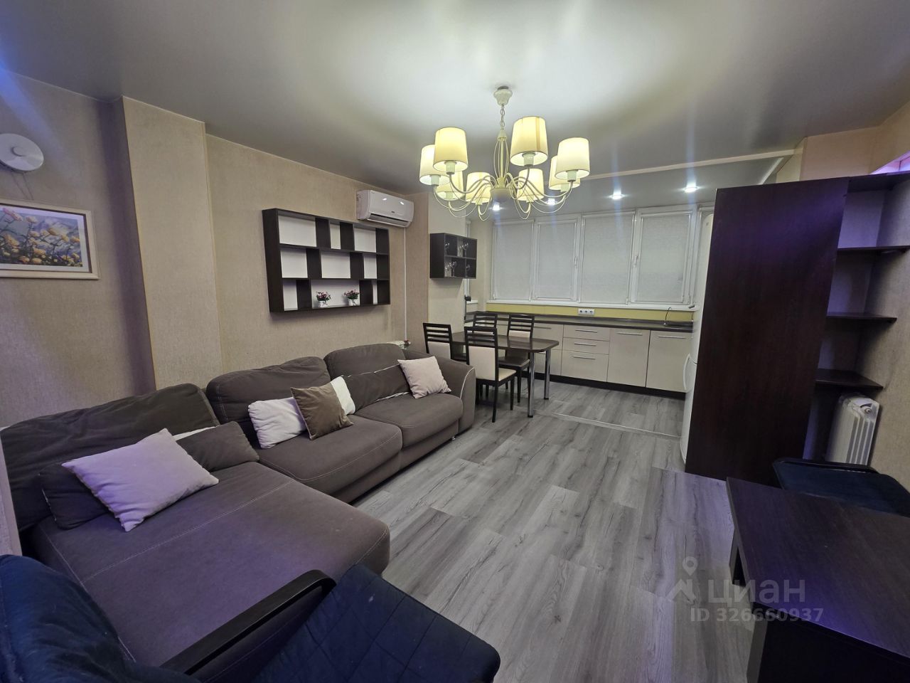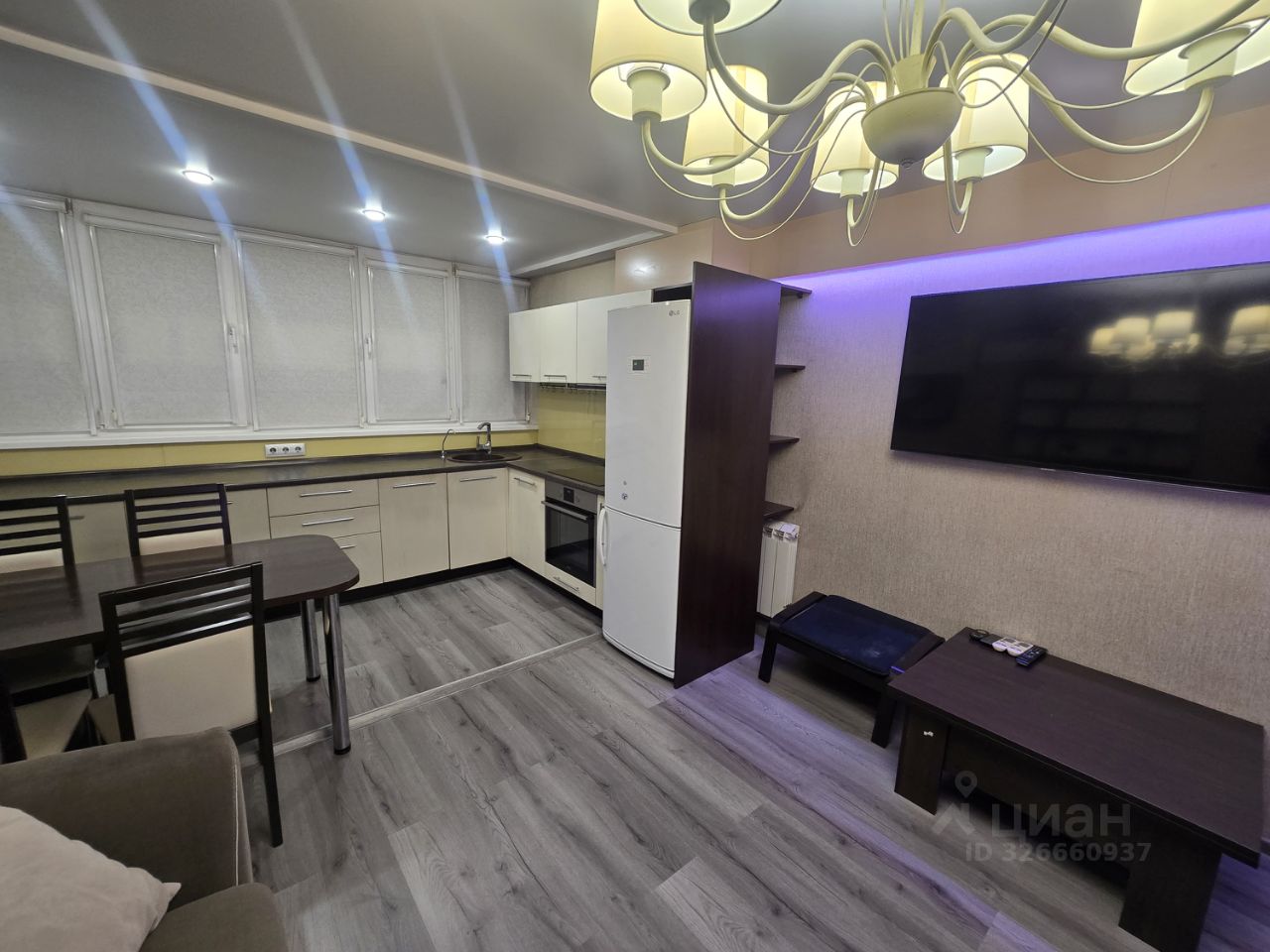 Кухня-студия S=20м2, (Встроенная корпусная кухня, посудомойка, варочная панель, духовой шкаф, холодильник, стол+стула, диван, кресло-качалка, журнальный столик, телевизор, КОНДИЦИОНЕР)