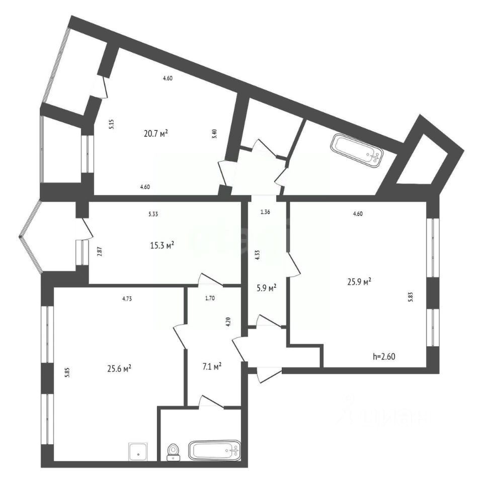 Привлекательная геометрика - квартира на две стороны, большая кухня- гостиная с двумя окнами, три раздельные спальни, две из которых с лоджией, а третья- с двумя окнами, которую можно поделить на две комнаты, три раздельных санузла.