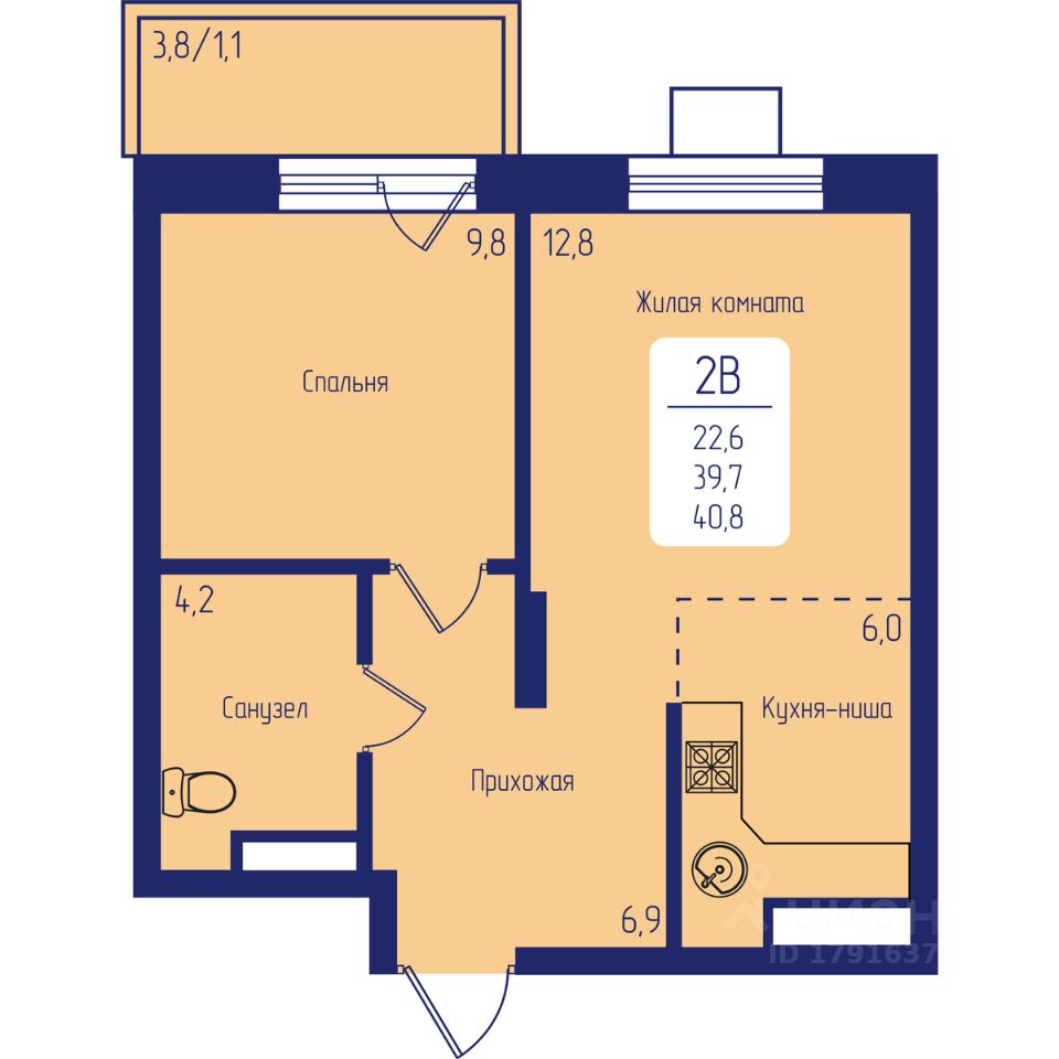 Общая площадь40,8 м²