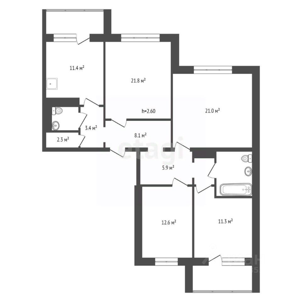 Комнаты располагаются раздельно, что гарантирует вам необходимое пространство и уединение в каждой зоне. Два балкона дополняют квартиру, предоставляя возможность для отдыха на свежем воздухе или организации небольшого сада.