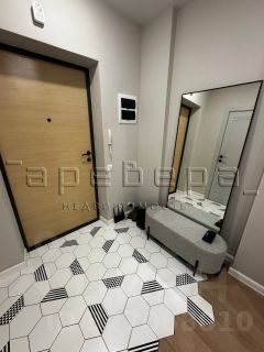 - В прихожей керамогранит с геометрическим узором, который добавляет акцент и визуально разделяет пространство.