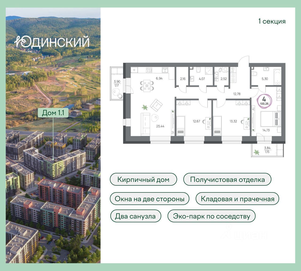 4-комнатная квартира, 100.25кв.м., 2 этаж