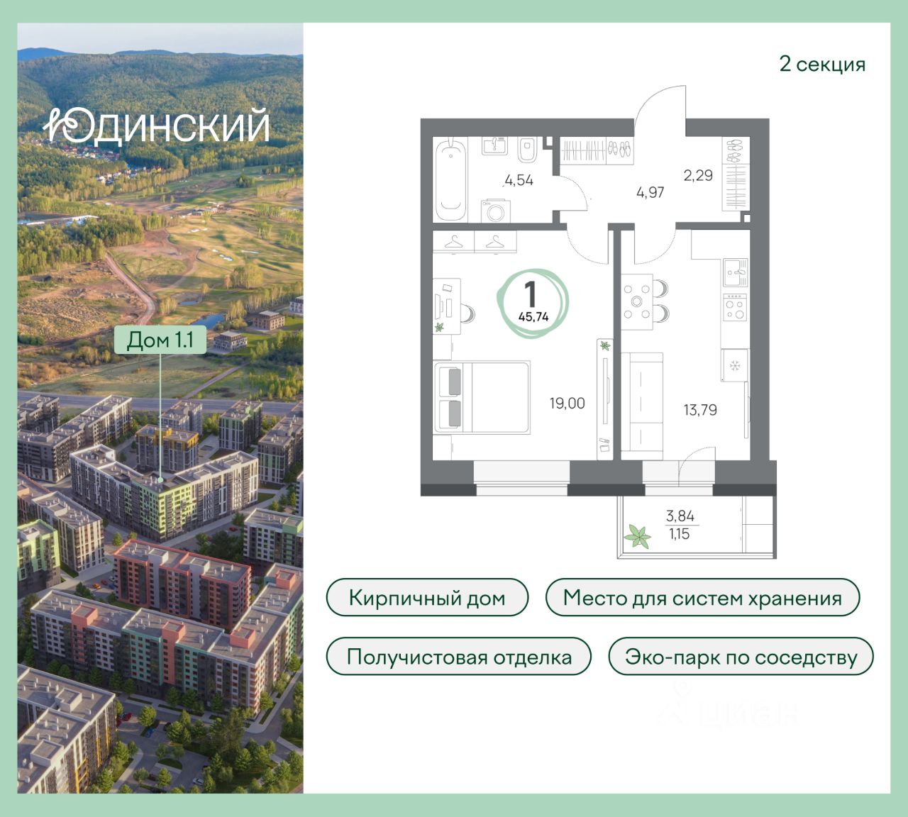 1-комнатная квартира, 45.74кв.м., 3 этаж