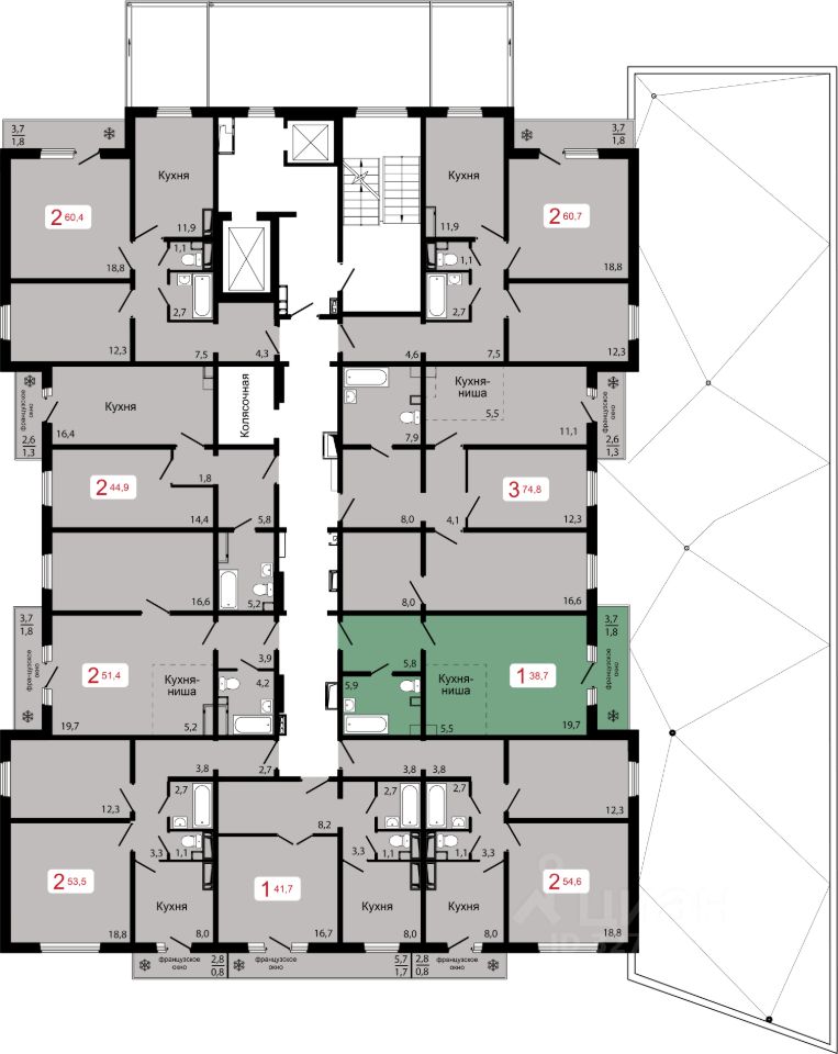 разнообразные классические и европланировки квартир: 1-комнатные площадью от 40-76 м2, 2-комнатные - 46-63 м2, 3-комнатные - 75-76 м2,