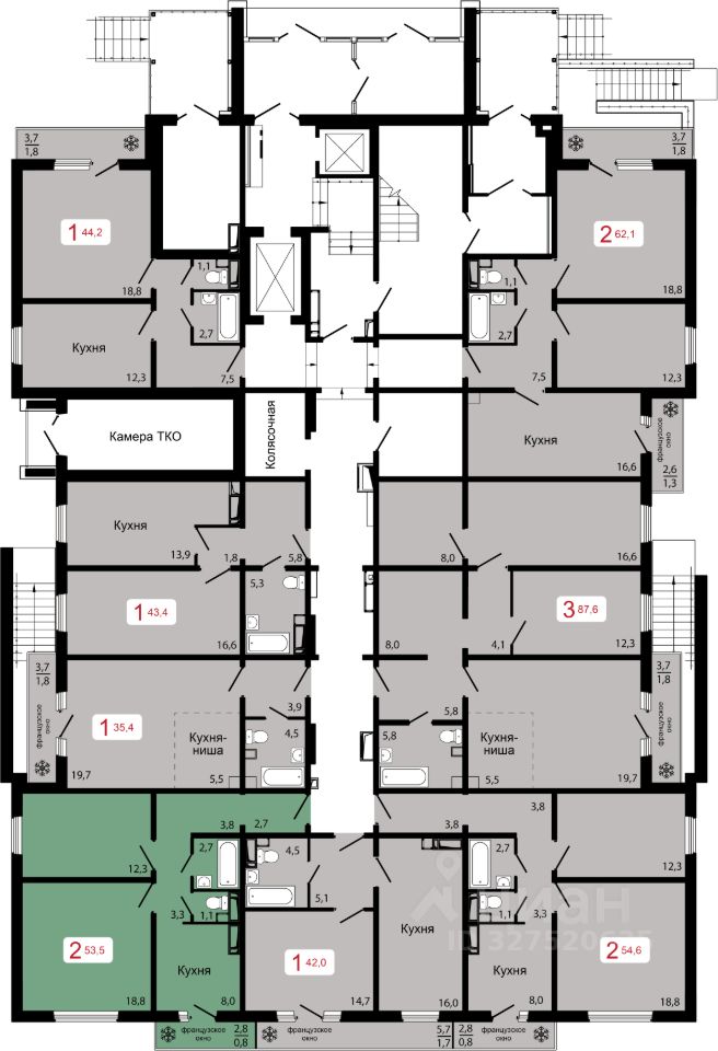 Продаётся 2-комнатная квартира в строящемся доме (Дом 3), срок сдачи: II-кв. 2027, общей площадью 53.5 кв.м., на 13 этаже.