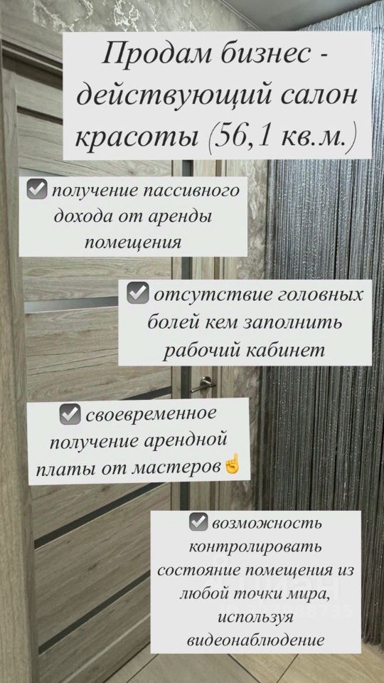 Продаётся салон красоты в Сосновоборске (работает более 6 лет) Предлагаю приобрести действующий салон красоты — место, где женщины, мужчины и дети доверяют заботу о своей красоте нашим мастерам. Бизнес сразу начнёт приносить доход: всё готово к работе. Почему это выгодно: Работает стабильно с 2019 года, выстроены чёткие процессы. Есть постоянная клиентская база: клиенты возвращаются и приводят друзей. Не нужно искать поставщиков, закупать оборудование или нанимать персонал. Можно продолжить в том же формате или добавить новые услуги. Местоположение г. Сосновоборск, первый этаж двухкомнатной квартиры. Рядом остановки, парковка, магазины и кафе — клиентам легко добираться. Статус помещения Квартира в собственности (один владелец, никто не прописан). Документы готовы к проверке. Площадь 56,1 м2. Пространство грамотно зонировано для комфортной работы мастеров и отдыха клиентов. Планировка Зоны: для парикмахеров (стрижки, окрашивания, укладки, причёски, дреды из канекалона); для мастера маникюра/педикюра; кабинет массажа; место для косметолога (уход за кожей, процедуры для молодости); зона ожидания с мягкой мебелью. Что входит в продажу: Квартира в собственности. Действующий бизнес с клиентской базой. Команда мастеров (парикмахеры, мастера маникюра/педикюра, массажист, косметолог, бровист/мастер перманентного макияжа) — готовы остаться с новым владельцем. Всё оборудование и мебель: парикмахерские кресла, зеркала, мойка, полки; столы, кресла и инструменты для маникюра/педикюра; массажный стол и принадлежности; оборудование для косметологических процедур; мебель для зоны ожидания (диваны, кресла, столики); бытовая техника, системы хранения; освещение, декор, вентиляция и кондиционирование. Система расчётов Мастера вносят оплату за использование рабочих мест по договорённости — стабильный доход. Можно сохранить эту модель или предложить свои условия. Удалённый контроль Камеры видеонаблюдения позволяют отслеживать работу из любой точки. Система архивирует записи и отправляет уведомления при срабатывании датчиков движения. О косметологе и специальных услугах Косметолог с медицинским образованием гарантирует безопасность процедур. В салоне доступна редкая услуга — гирудотерапия (постановка пиявок) с соблюдением всех санитарных норм. Услуга пользуется спросом у клиентов, ценящих натуральные методы оздоровления. Преимущества для нового владельца: не нужно тратить время на старт — всё готово; поток клиентов уже есть; команда остаётся — не надо набирать персонал; доход можно получать сразу; удалённое управление экономит время; можно оставить текущий формат или изменить направление. Цена 6 700 000 рублей. Контакты Telegram: Звоните или пишите — отвечу на вопросы и организую показ в удобное время. Покажу всё лично и помогу представить, как можно развить салон дальше!