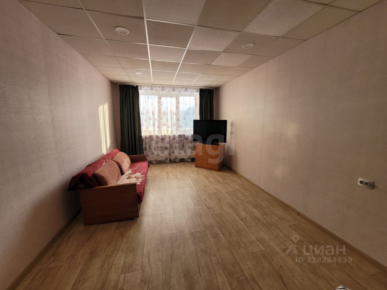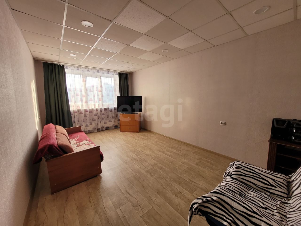 В квартире выполнен косметический ремонт: окна ПВХ, входная и межкомнатные двери старого образца, стены оклеены обоями, в комнатах установлен потолок армстронг, на кухне оклеен пенопластовыми панелями, полы деревянные, застелен линолеумом, радиаторы отопления медные.