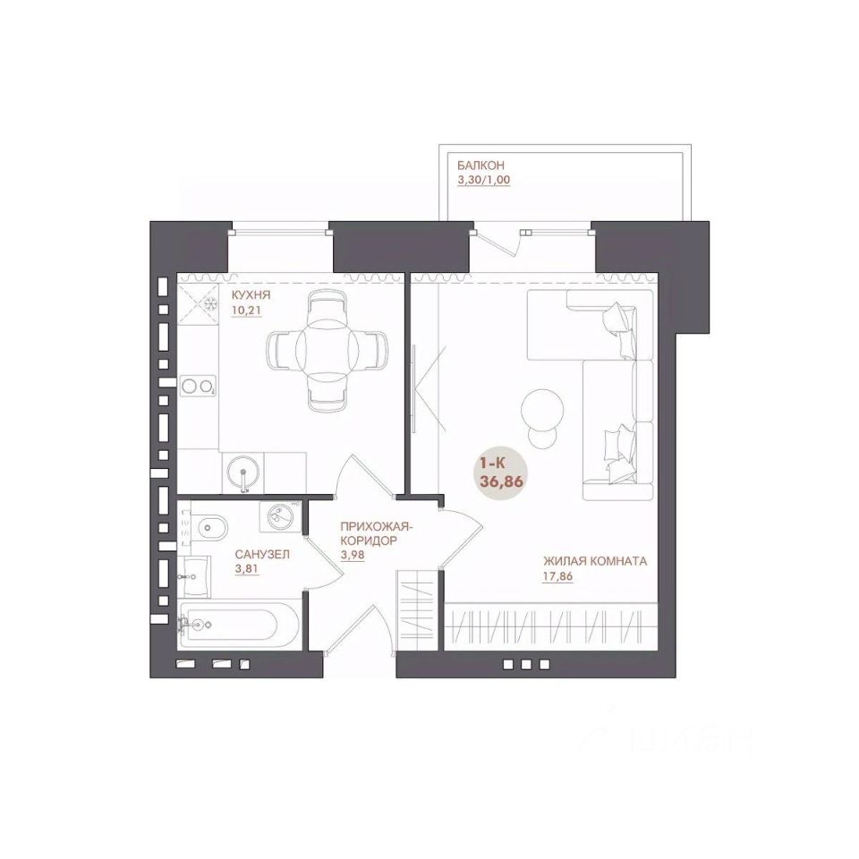Общая площадь36,86 м²