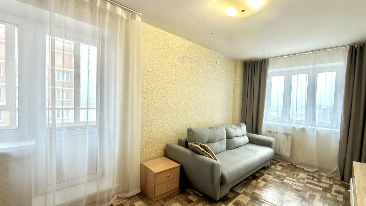 В квартире остается вся мебель и техника, просторная комната с двумя окнами дает возможность зонировать пространство (сделать отдельную спальню). Просторный балкон застеклен с видом на город. Ванная комната оборудована водонагревателем, мокрая зона в кафеле, а также теплый пол. По всей квартире установлены современные радиаторы отопления, высокие потолки. Квартира полностью готова к проживанию без вложений.