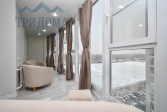 В квартире сделан дизайнерский ремонт, кухня гостинная объединена с балконом с панорамными окнами, из которой открывается живописный вид на реку и город.