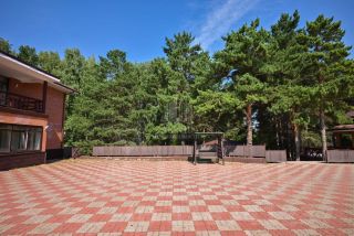 Половина участка — в сосновом лесу, вторая половина вымощена тротуарной плиткой.