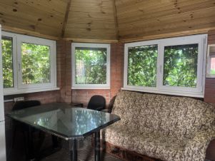 Беседка теплая со встроенным мангалом (6 х 4 м) Материал: кирпич, пол брусчатка, окна ПВХ.