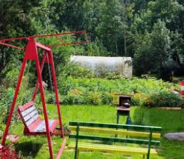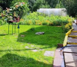 Отдельностоящая баня. На участке расположены многочисленные многолетние насаждения, сад, теплица, качели. Большая зеленая зона с газоном.