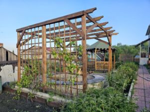Детский уголок, беседка, зона барбекю и мангал — для летних вечеров с семьёй и друзьями.