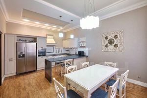 Сердце дома: огромная кухня-гостиная с высокими потолками, создающими ощущение простора и свободы. Мощная аудиосистема наполнит это идеальное пространство для приёмов безупречным звуком.