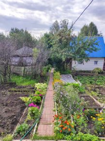 На участке много деревьев: ирга, яблони, вишня, смородина, дуб, береза, кедр, облепиха. Ухоженный участок, много цветов.