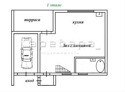 На первом этаже дома находится большая кухня—гостиная для приема гостей с уютным камином и большим диваном у телевизора.