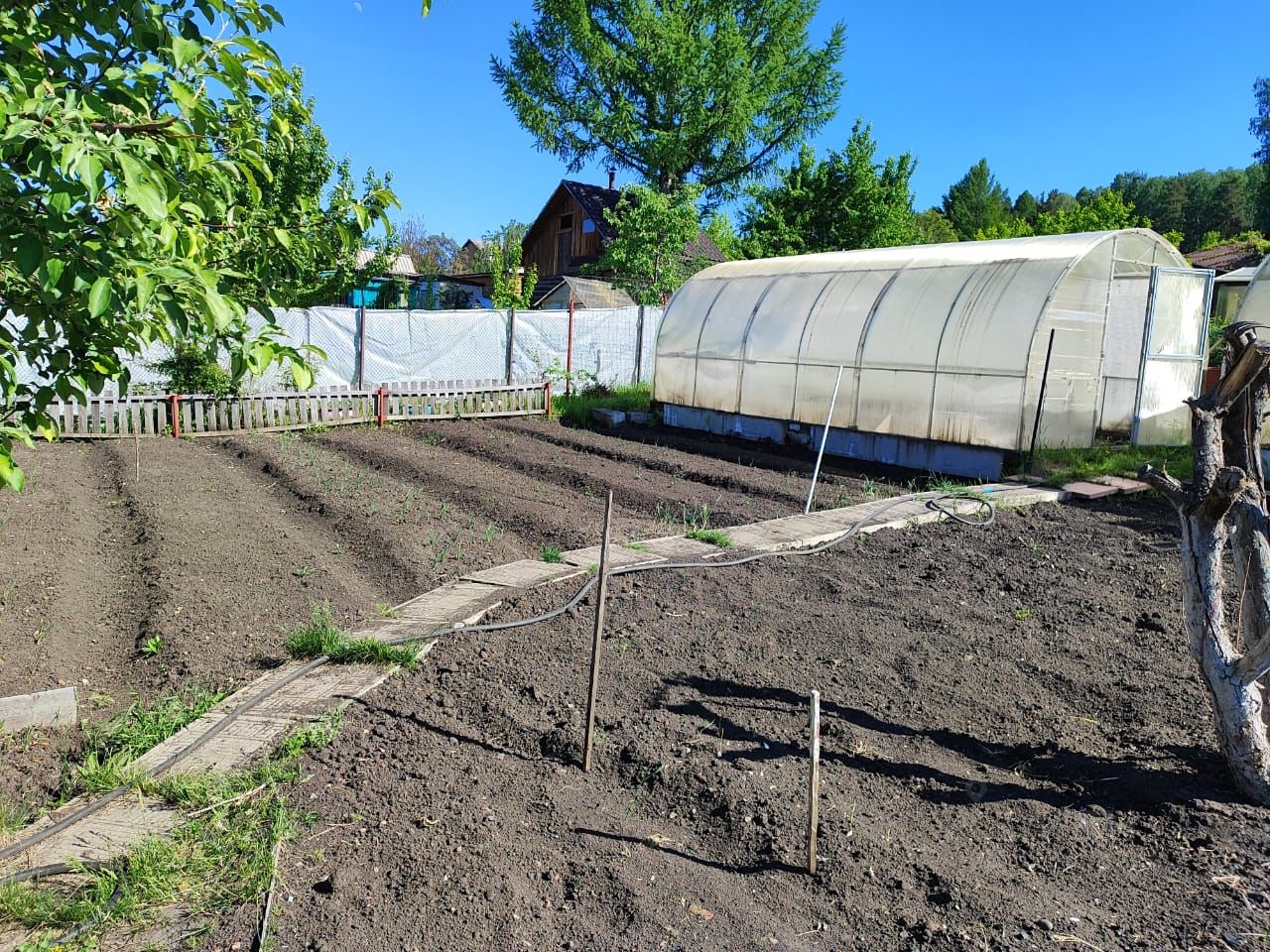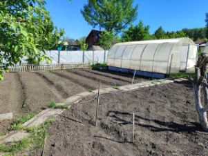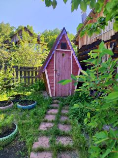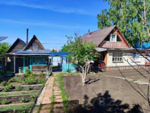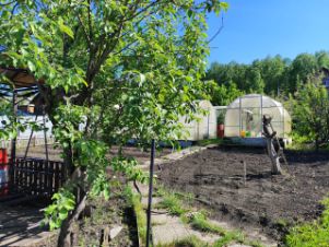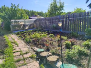 Участок 6 соток, имеется баня на фундаменте из кругляка, три теплицы, площадка под бассейн, дровяник, помещение для инструментов, есть строение из шпалы (использовалось для кур). Дорожки выложены плиткой.