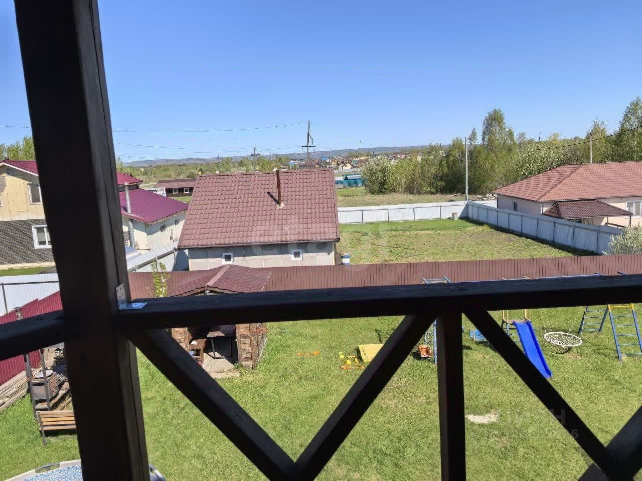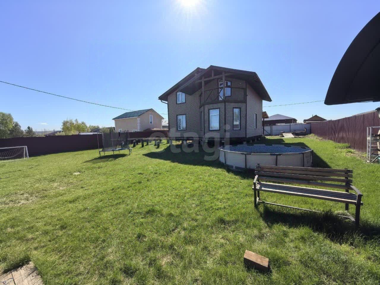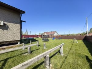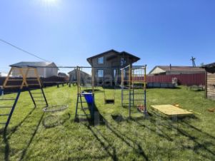 На участке беседка, мангал с освещением, детская зона(песочница, спортивный комплекс ), газон по всему заднему двору