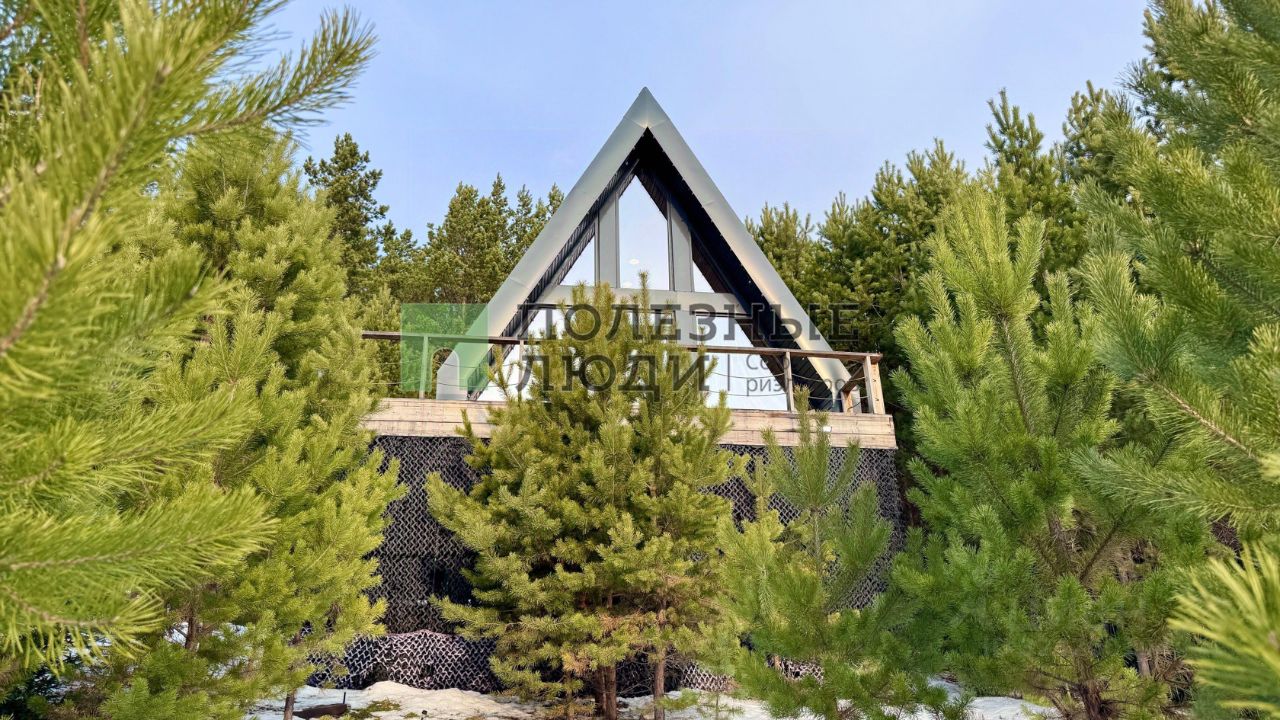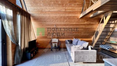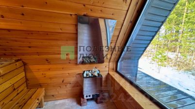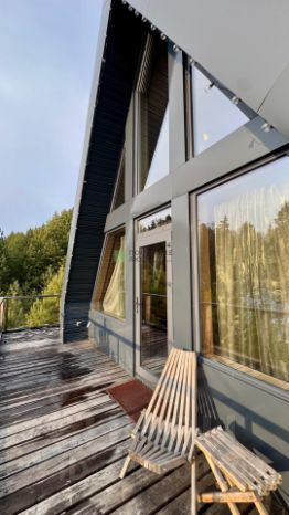 А-фрейм очень просторный и вмещает в себя на первом этаже кухню-гостиную, сауну с панорамным окном в лес, современный санузел и бытовое помещение для хранения вещей и доступа к электрическому котлу отопления, бойлеру и всем коммуникациям. На втором этаже спальня с шикарным видом на участок.