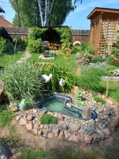 Зона отдыха: беседка, дорогой мангал с крышкой, две качели под навесами, искусственные пруд, есть небольшой бассейн 1,5*2