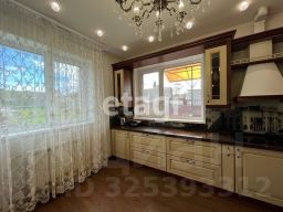 - Кухня оборудована мебелью из массива и встроенной техникой, а также печью с твердотопливным и электрическим котлами для эффективного обогрева.