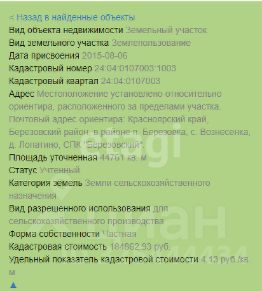 Земельный участок площадью 4,5 га расположен в Березовском районе Красноярского края, в 600 метрах от деревни Лопатино. Территория имеет незначительный уклон, что делает ее удобной для сельскохозяйственного использования. В настоящее время участок используется как сенокосное угодье, но его потенциал значительно шире — здесь можно организовать фермерское хозяйство, выращивание культур или разведение скота. По границе участка протекает небольшой ручей, обеспечивающий естественный источник воды для полива или водопоя животных.