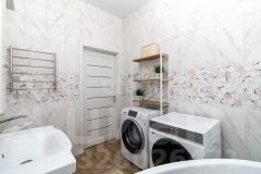Планировка первого этажа функционально объединяет просторную кухню-гостиную и прачечную, а также включает гараж на два автомобиля. На второй этаж ведет лестница с кованными перилами, где расположены три изолированные спальни, объединенные выходом на большой балкон, и светлый холл с панорамными окнами, открывающими вид на город.