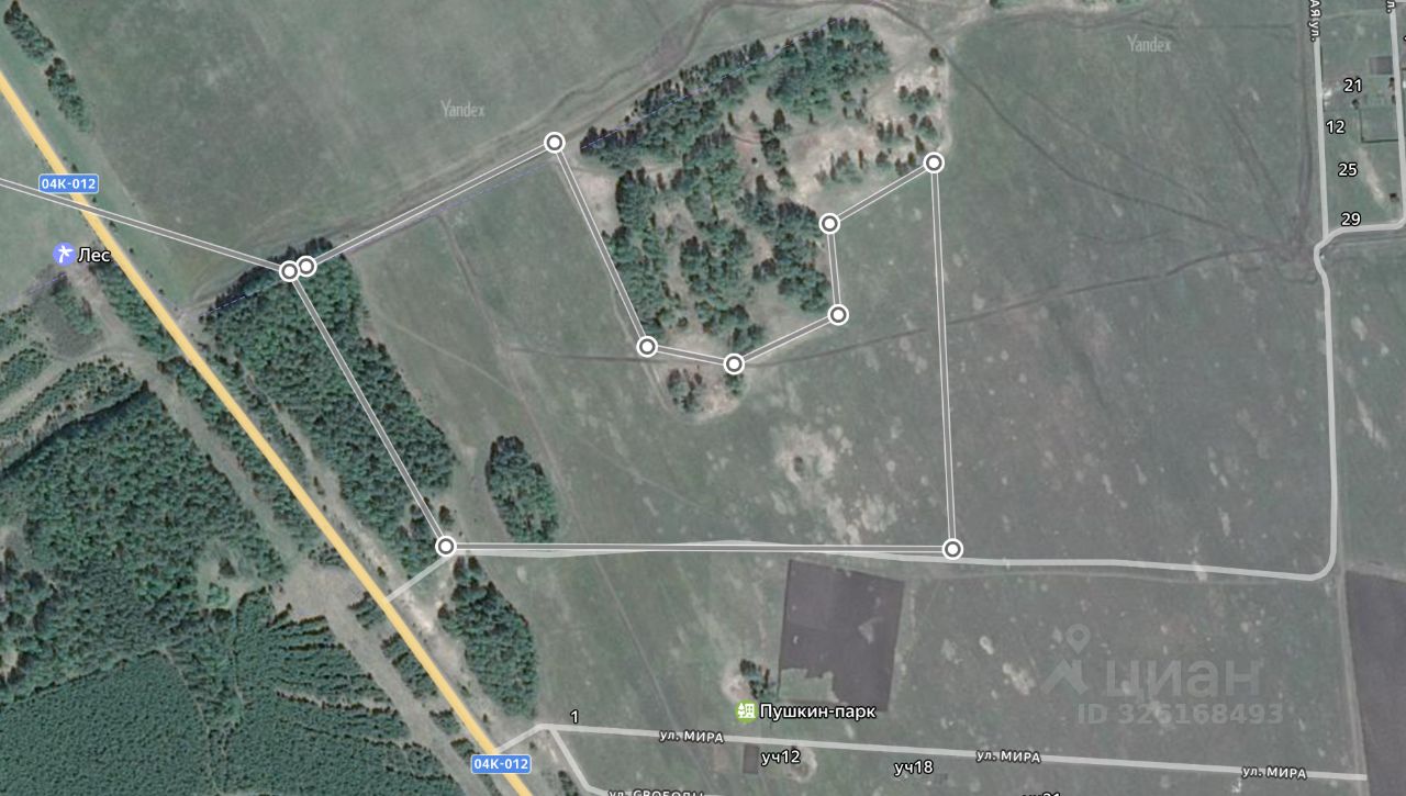 Продаётся земельный участок площадью 11, 5 га. Удобное расположение, практически по границе участка проходит асфальтированная дорога. По границе участка проходит линия ЛЭП. Между асфальтированной дорогой и участком растёт лес, большая часть участка свободная от леса, ежегодно выкашивалась