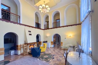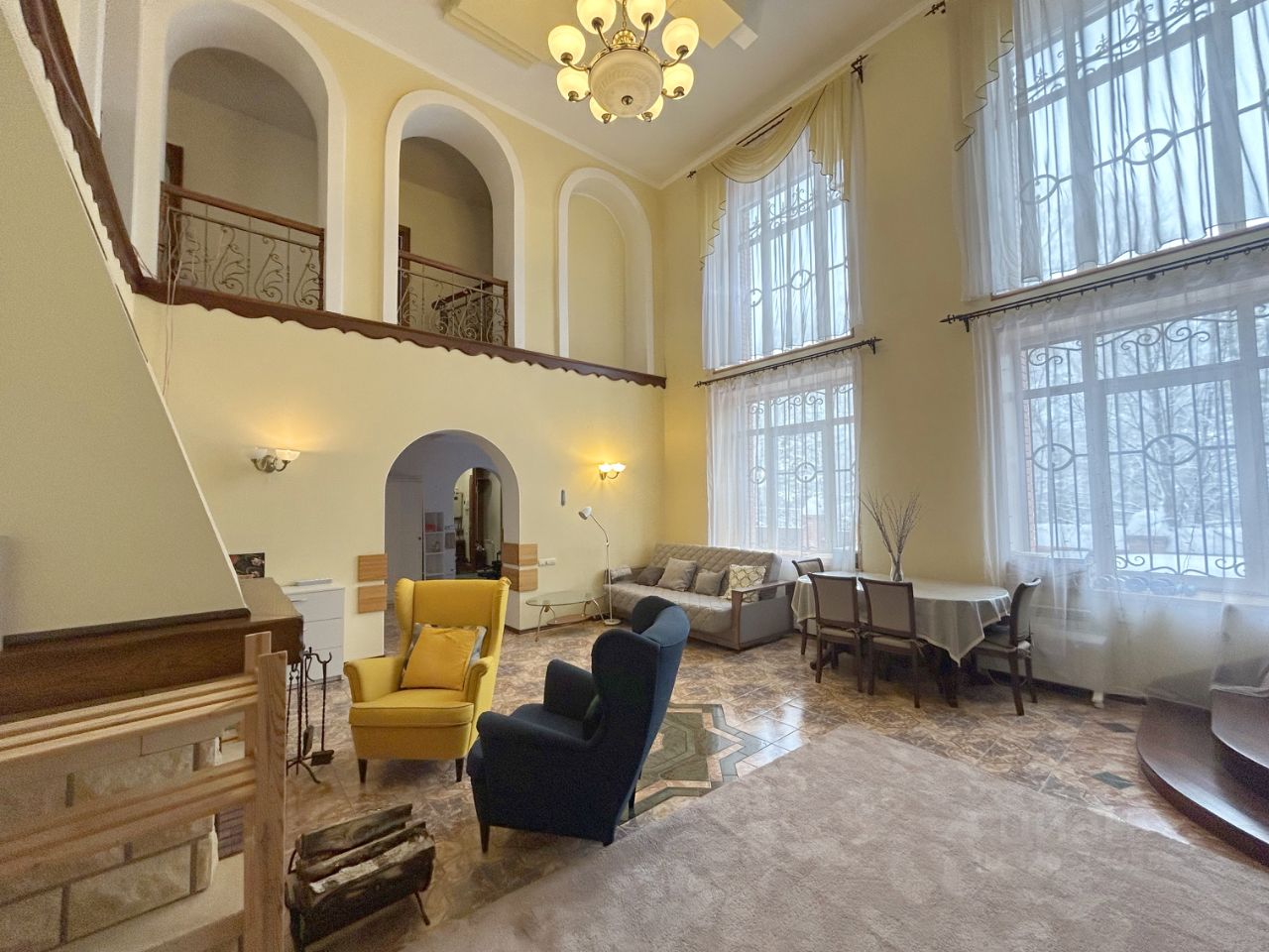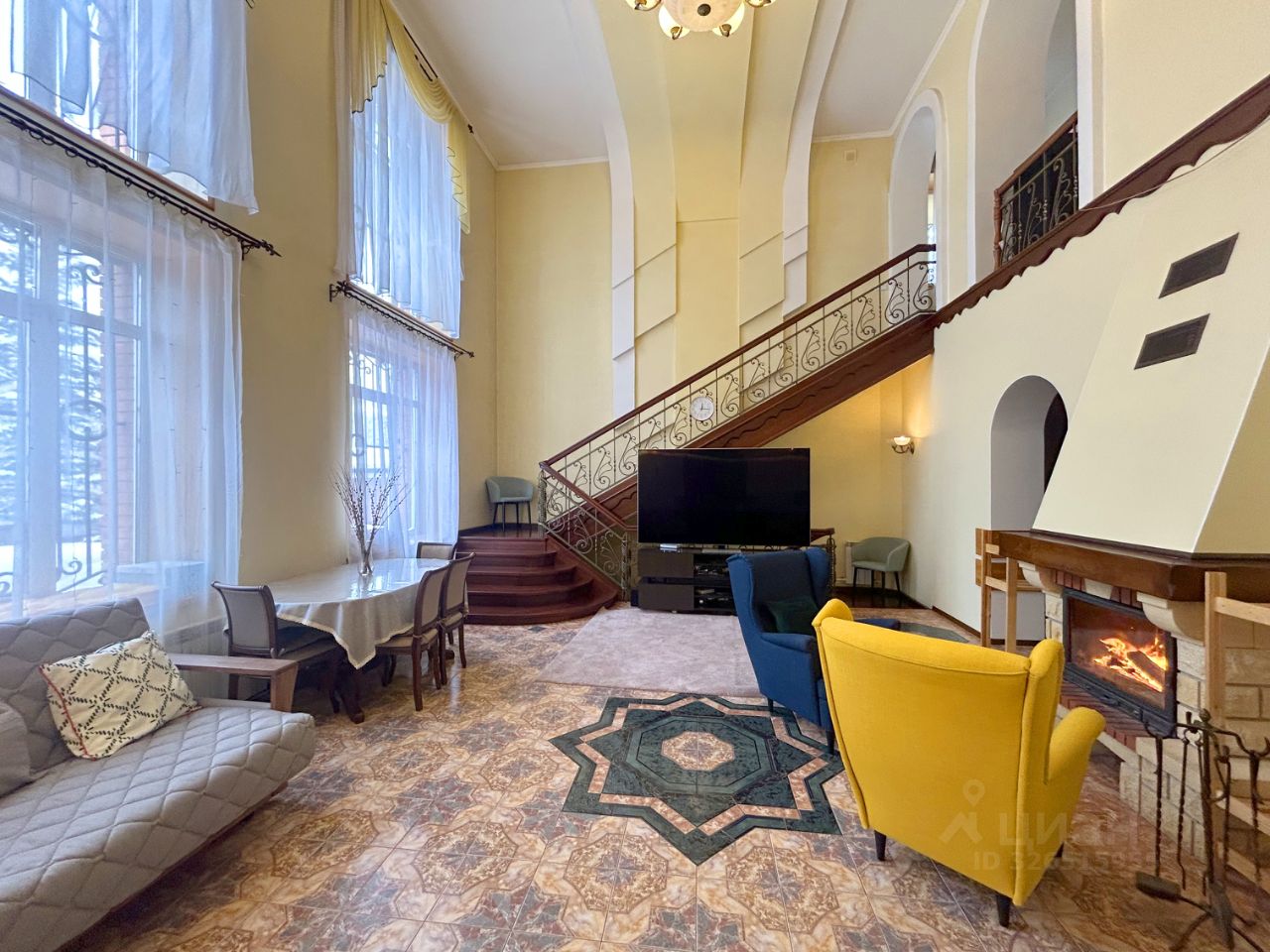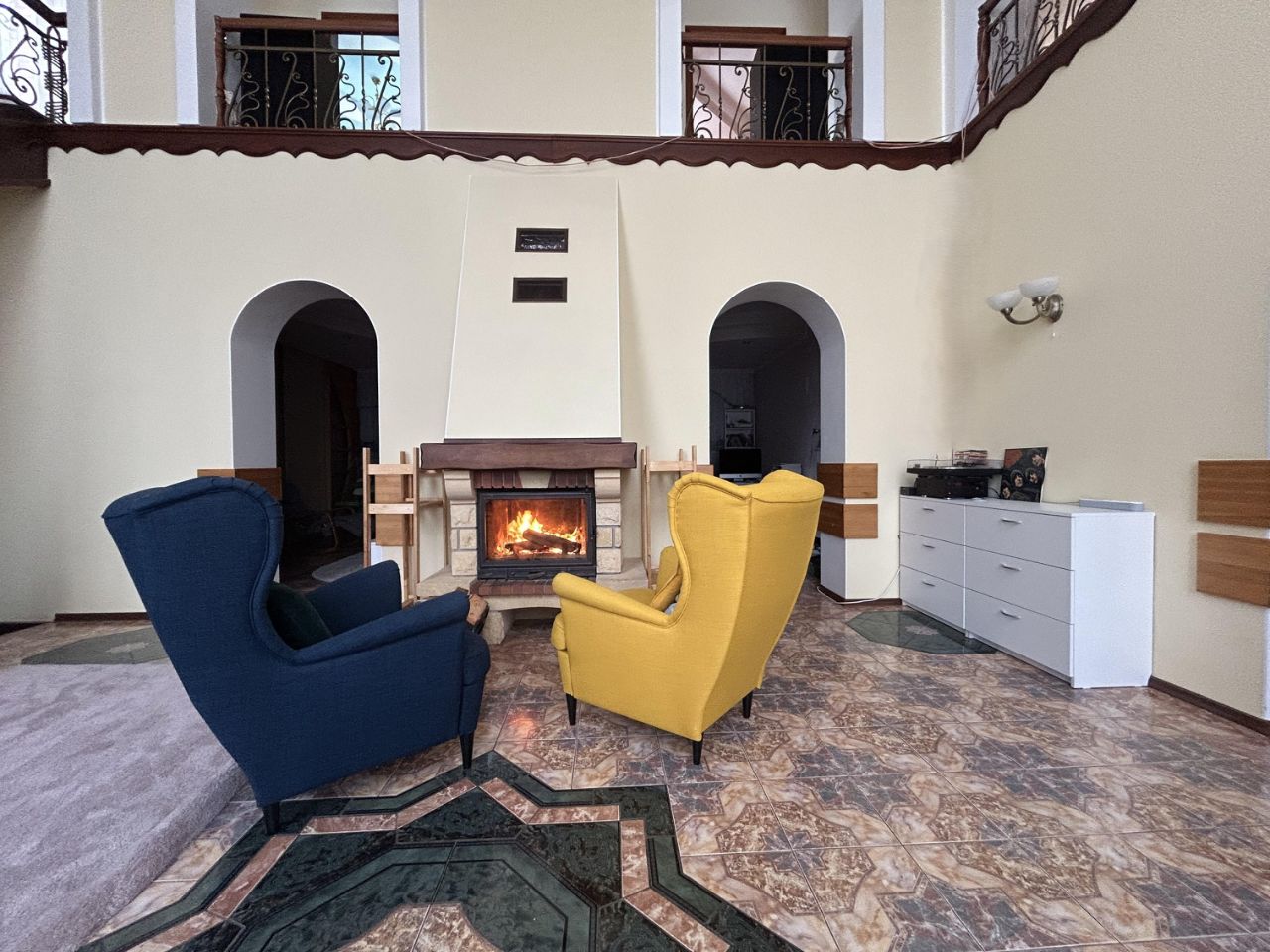 Гостиная (верхний свет, высота потолков до 6метров), камин готов принять погреться у огня всех членов семьи и гостей.