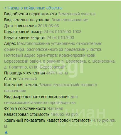 Земельный участок площадью 4,5 га расположен в Березовском районе Красноярского края, в 600 метрах от деревни Лопатино. Территория имеет незначительный уклон, что делает ее удобной для сельскохозяйственного использования. В настоящее время участок используется как сенокосное угодье, но его потенциал значительно шире — здесь можно организовать фермерское хозяйство, выращивание культур или разведение скота. По границе участка протекает небольшой ручей, обеспечивающий естественный источник воды для полива или водопоя животных.