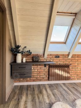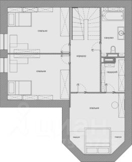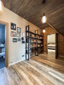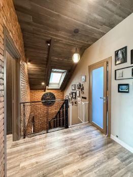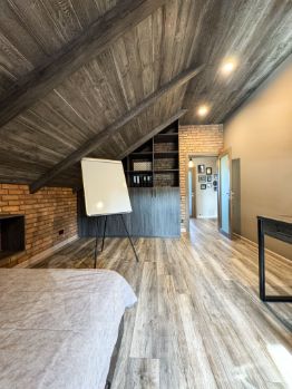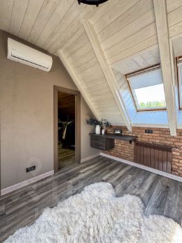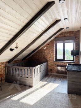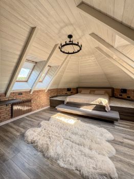 2. На втором мансардном этаже расположены три функциональные комнаты, каждая оформлена в индивидуальном стиле с продуманным интерьерным решением. Спальня с отдельной гардеробной, рабочий кабинет со спальным местом и детская.