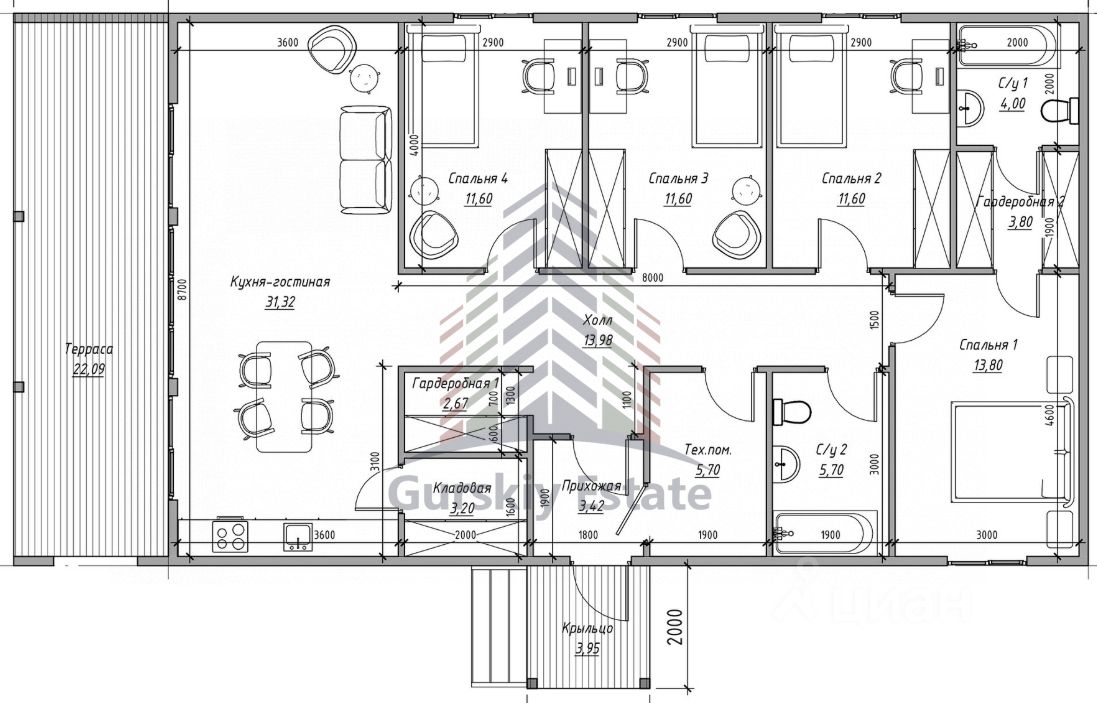 Раздельная планировка комнат обеспечивает комфортное проживание для каждого члена семьи. Большая кухня гостиная с обеденной зоной и панорамным окном имеет выход на террасу. Санузел совмещенный, просторная ванная комната. Внутренняя отделка белый куб позволяет создать интерьер комнат по вашему вкусу, а наличие в доме кладовой комнаты помогут организовать удобное хранение вещей и поддерживать порядок в доме.