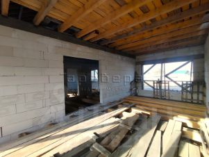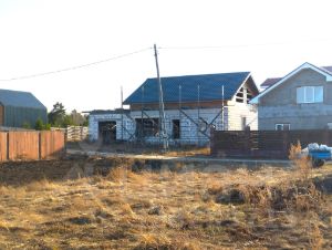 Дом еще не достроен, выполнен из газобетона, под крышей, и частично остеклен, окружен забором, скважина глубиной 18 м, подключено электричество.