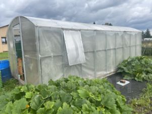 Возделываемый огород, небольшой парник, теплица 3х6 метров с грядами внутри из поликарбоната с системой автоматизированной вентиляции.